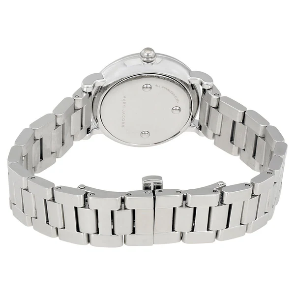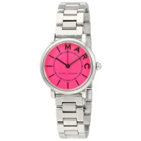Silver-tone stainless steel case with a silver-tone stainless steel bracelet. Fixed silver-tone stainless steel bezel. Fuchsia dial with black hands and index hour markers. Dial Type: Analog. Quartz movement. Scratch resistant mineral crystal. Pull / push crown. Solid case back. Case size: 28 mm. Round case shape. Deployment with push button release clasp. Water resistant at 50 meters / 165 feet. Functions: hour, minute, second. Dress watch style. Marc Jacobs Roxy Fuchsia Dial Ladies Stainless Steel Watch MJ3528.