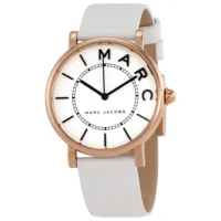 Rose gold-tone stainless steel case with a white leather strap. Fixed rose gold-tone bezel. White dial with black hands and index hour markers. Minute markers around an inner ring. Dial Type: Analog. Quartz movement. Scratch resistant mineral crystal. Pull / push crown. Solid case back. Case size: 36 mm. Case thickness: 9 mm. Round case shape. Band width: 18 mm. Tang clasp. Water resistant at 50 meters / 165 feet. Functions: hour, minute, second. Dress watch style. Marc Jacobs Roxy White Dial White Leather Ladies Watch MJ1561.